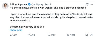 “I’ve never felt this much behind as a programmer. The profession is being dramatically refactored as the bits contributed by the programmer are increasingly sparse and between. I have a sense that I could be 10X more powerful if I just properly string together what has become available over the last ~year and a failure to claim the boost feels decidedly like skill issue.”
